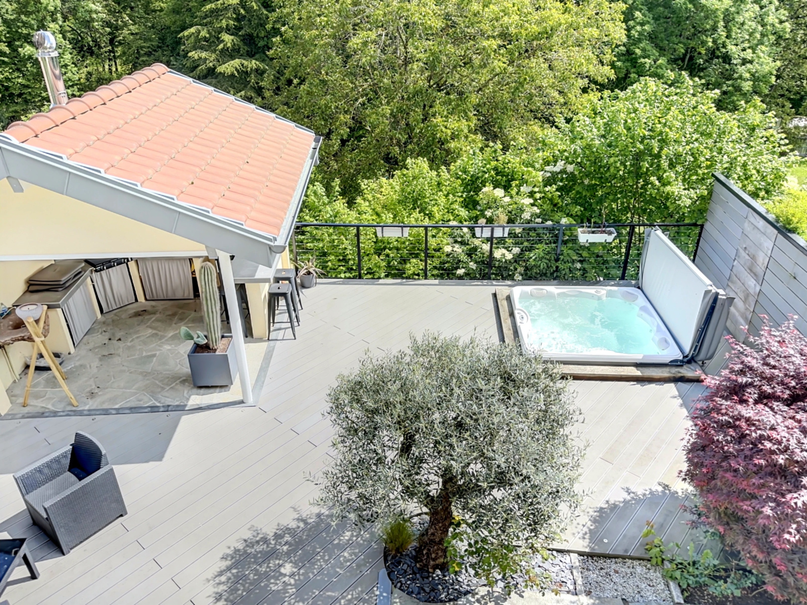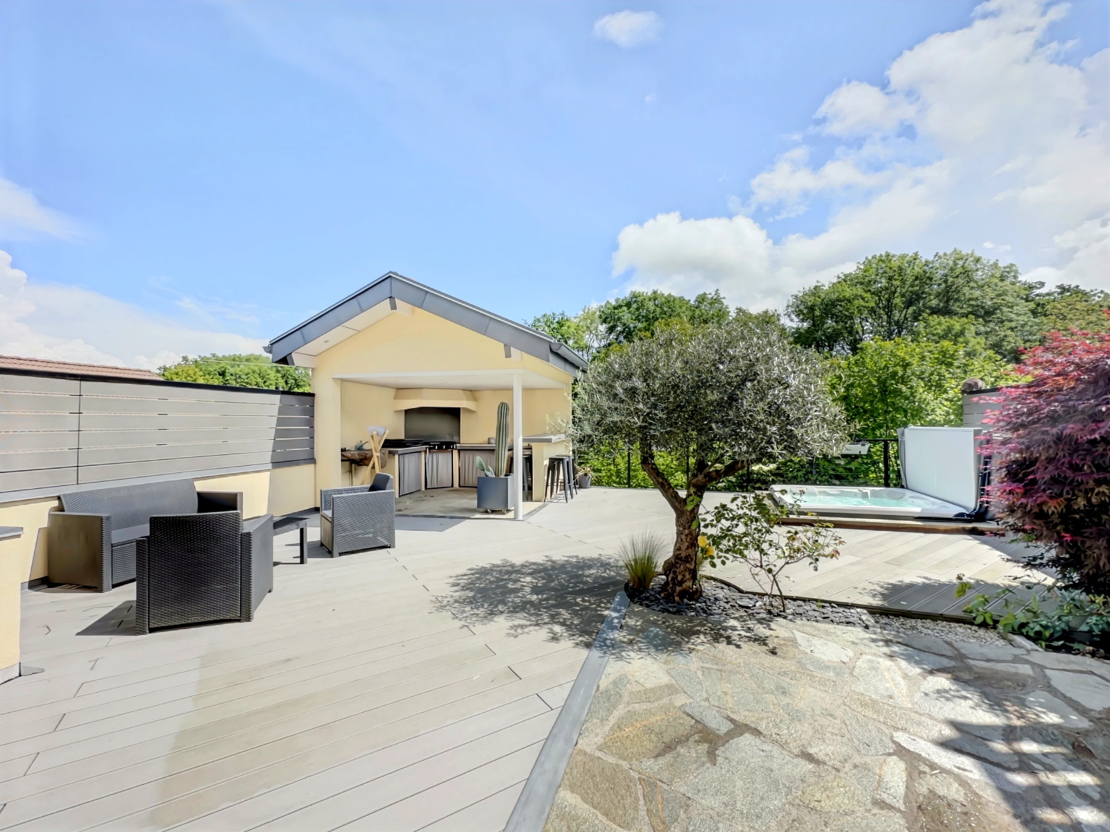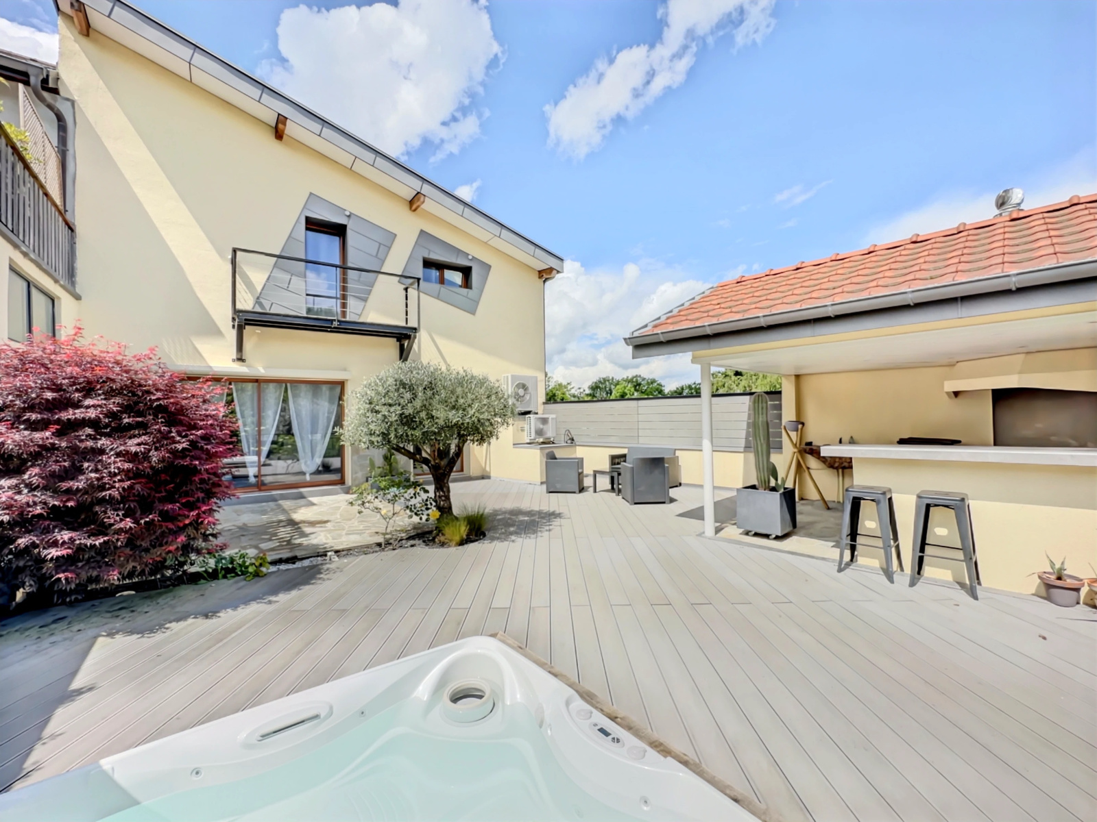 Dès l'entrée, vous voudrez la visiter dans sa totalité. L'espace de vie généreux avec son accès sur la terrasse de 100m2, sa cuisine d'été et son jacuzzi vous permettront de profiter pleinement de vos réceptions entre amis ou en famille.
